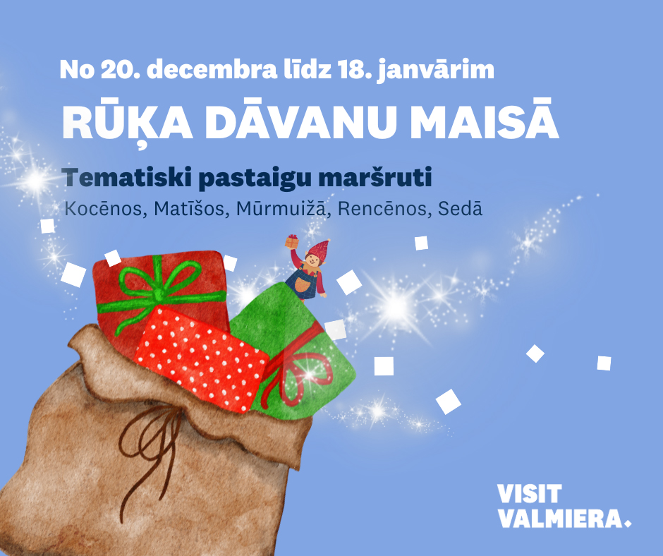 No 20. decembra līdz 18. janvārim Valmieras novadā iemirdzēsies pieci tematiski ziemas pastaigu maršruti «Rūķa dāvanu maisā», kas mudinās izkustēties un mazliet ļauties brīnumiem kā lieliem, tā maziem!