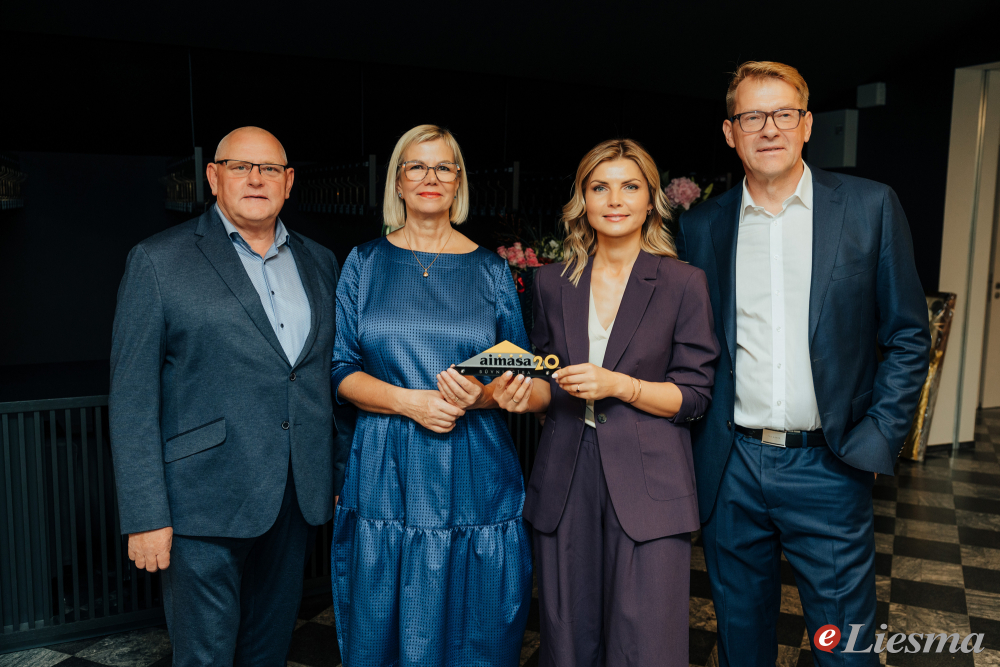 2024. GADA OKTOBRĪ. «Aimasas» 20 gadu jubilejas svinībās – Jānis Dreimanis (no kreisās), Ineta Dreimane, Madara Apsīte un Sandris Apsīts. Pasākums kopā ar otrajām pusēm. «Aimasas» arhīva foto