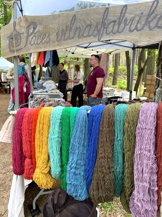 KRĀSU TOŅI, kas nedod miera. Gan vienkrāsainas šķeteres, gan krāsu salikumi. Daudzkrāsainajām salikums neatkārtojas. Ar savu produkciju vilnas fabrika reti ir tirgos, bet Latvijas Etnogrāfiskā Brīvdabas muzeja gadatirgū vienmēr. Foto no personīgā arhīva