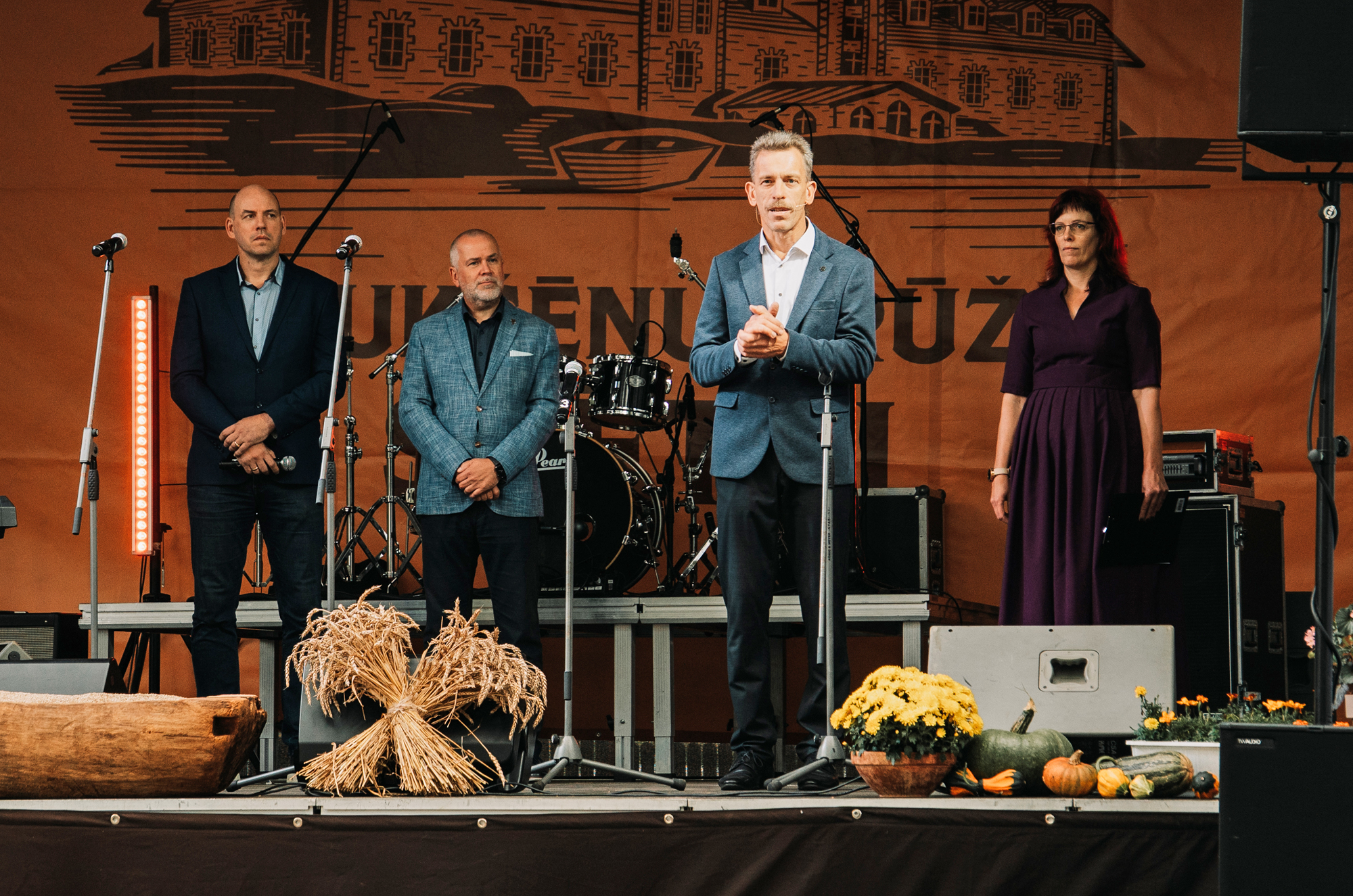 Svētku dalībniekus uzrunā mājastēvs SIA «Naukšēni» valdes priekšsēdētājs Jurģis Krastiņš.
