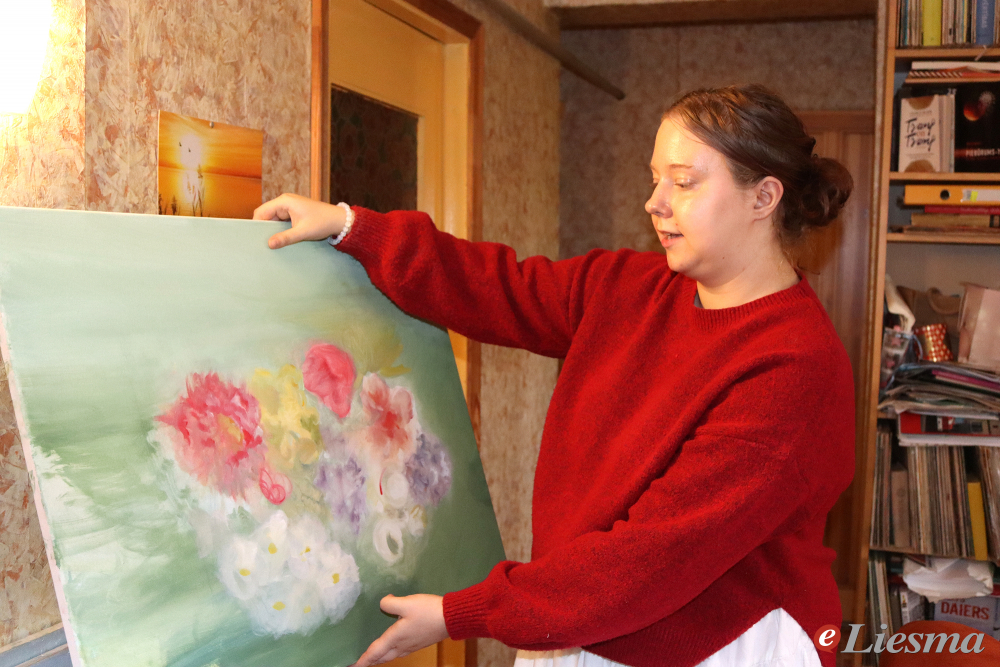 ALISE PATRĪCIJA ALBERINGA rāda ziedu gleznu – buķeti mammai. Ārijas Romanovskas foto