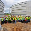 UZ VOC JUMTA VISS NOTIEK! Šī darbu fronte atrodas teju pārdesmit metrus virs zemes, tāpēc strādnieki ievēro visus nepieciešamos drošības pasākumus, drošības virves, strādājot pie jumta malas (tur arī drošības sētiņa uzbūvēta), ieskaitot. Laika apstākļi šonedēļ ideāli, taču ir padomāts arī par tobrīd atvērtās jumta konstrukcijas piesegšanu lietus laikā. Attēla labajā pusē jau var redzēt ar pelēku PROTAN membrānu nosegtos jumta fragmentus.