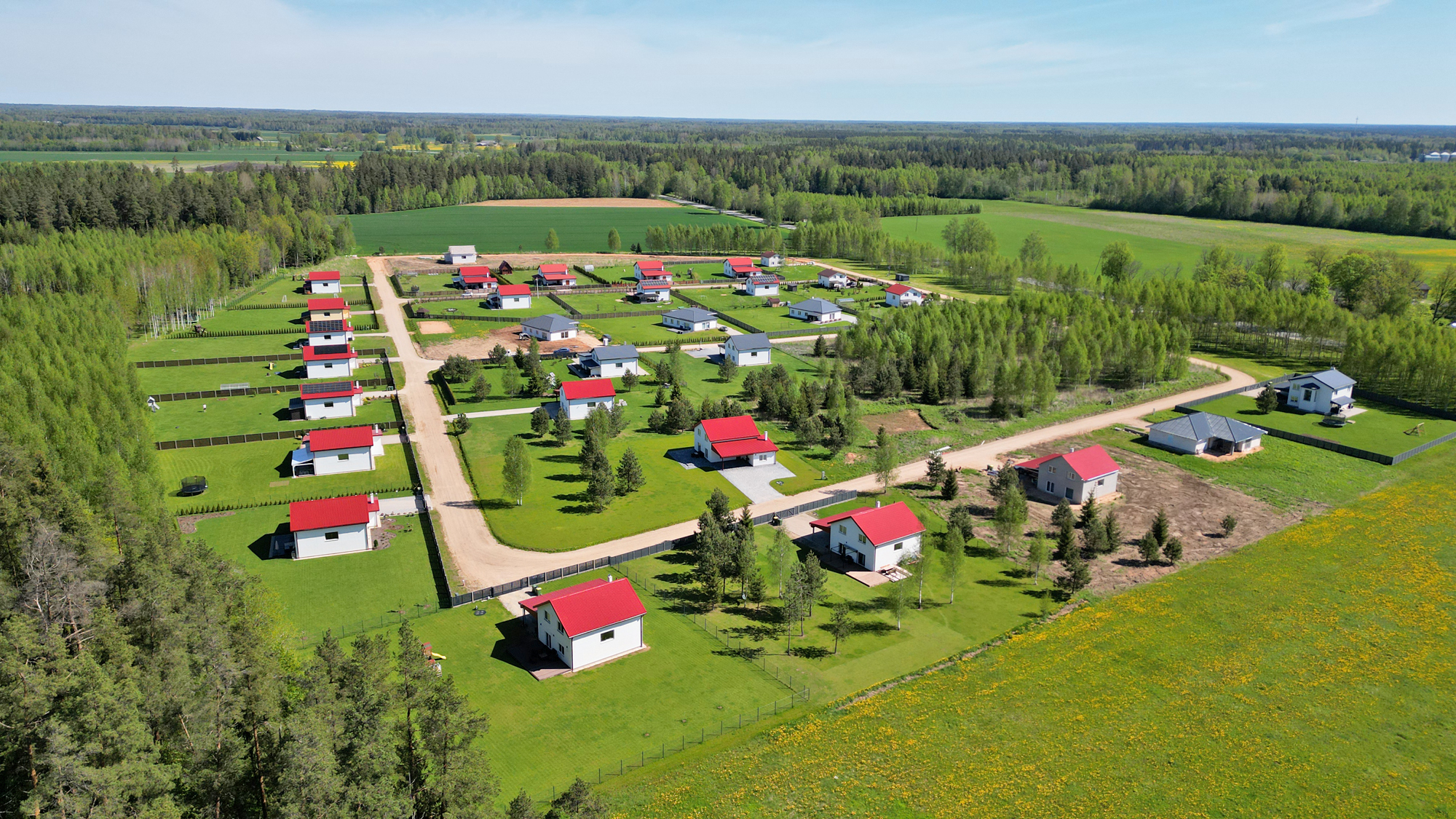 NO PUTNA LIDOJUMA. Ja pilnīgi precīzi, tad šeit par Poķu kopskatu no gaisa gādājis drons. Kā redzams, blakus Valmieras – Rūjienas šosejai (attēla labajā pusē) izveidojies paliels ciemats, kas jau tuvākajos gados sasniegs plānoto 38 privātmāju apjomu. Foto no LVKV arhīva