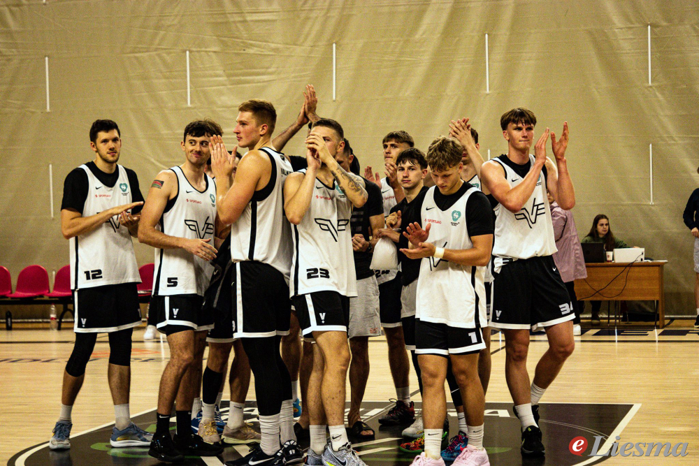 PĒC UZVARAS. Valmierieši pateicas skatītājiem pēc vienīgās pārbaudes spēles savā laukumā VOC, kad visai pārliecinoši tika apspēlēti LU studenti. Foto no Valmiera Glass/ViA arhīva