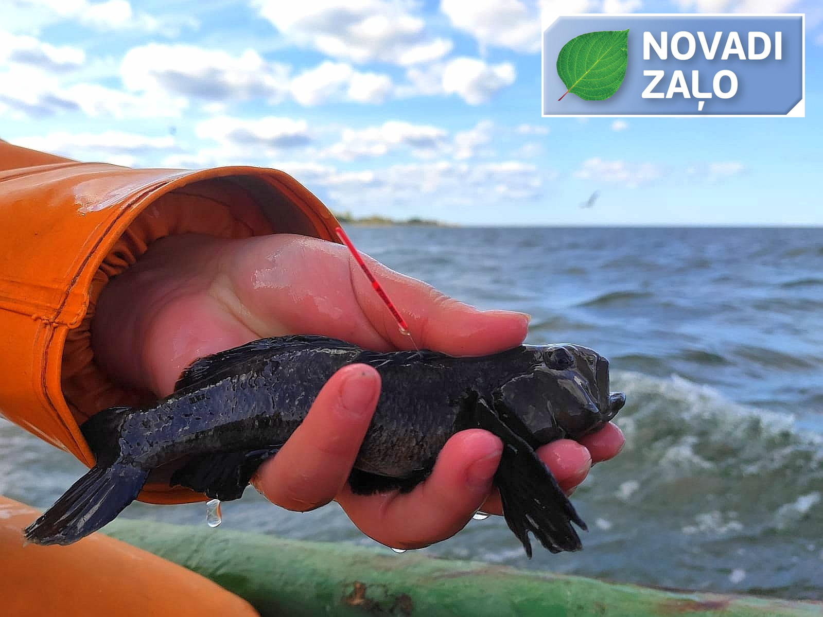 Apaļais jūrasgrundulis iezīmēts ar enkurtipa zīmīti, ko rotā uzraksts “BIOR Rīga”. Pēc tam zinātnieki to laidīs atpakaļ jūrā un gaidīs ziņu no zvejniekiem par atkārtotu noķeršanu.