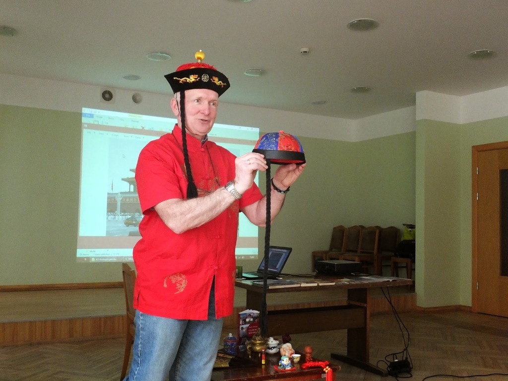 LABPRĀT STĀSTU PAR REDZĒTO, saka Pēteris Strubergs, kurš stāstīto papildina, rādot fotogrāfijas, uzņemto video un dažādus atvestos suvenīrus. Runājot par Ķīnu, viņš lepojas ar tirgotāju cepurēm. Foto no zinību biedrības «Gaismas dārzs»