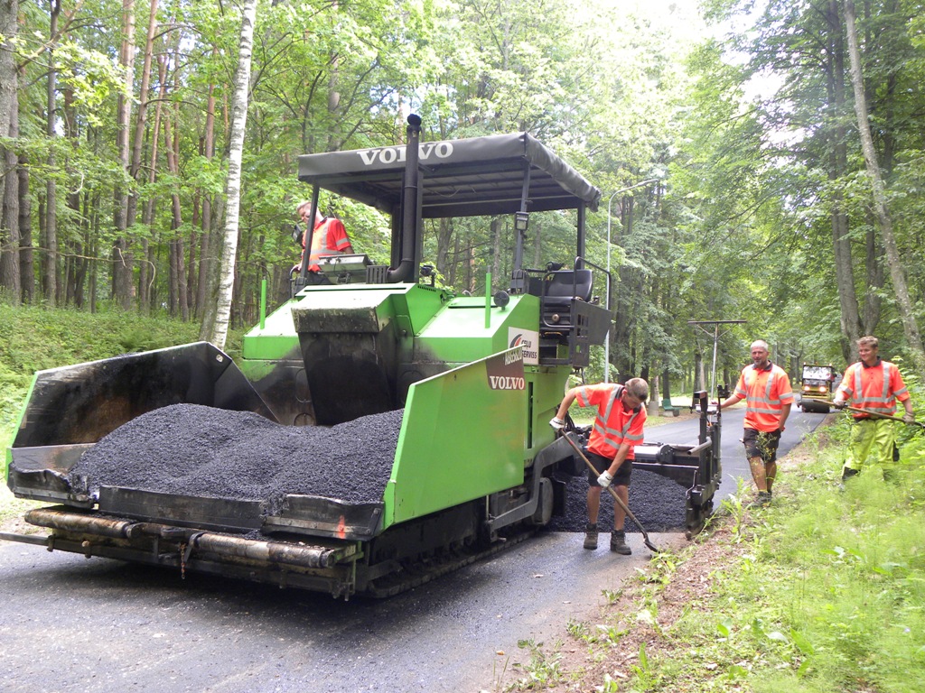 RĪDZINIEKIEM DARBI SOKAS. Otrdienas pēcpusdienā Ceļu Servisa asfaltētāji čakli strādāja pārsimt metrus no Dīvala kapiem, uz vecā bedrainā un saplaisājušā celiņa asfaltbetona klājot jaunu izlīdzinošo kārtu. Ik pēc pārdesmit metriem asfaltbetona klājēja bunkurā no pašizkrāvēja tika ieslidināta kārtējā porcija asfaltbetona masas, savukārt jau gatavo segumu tūlīt noblietēja ceļa rullis. Tā kā jaunā celiņa platums pilnībā nosedz veco, vienlaikus ar karstās asfaltbetona masas klāšanu, faktiski pirms klāšanas, nācās attīrīt arī jaunās asfalta klātnes malu no dažādiem sanesumiem un meža kritalām.