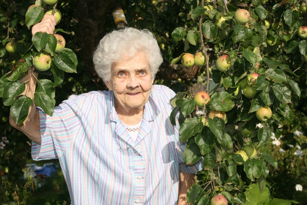 RAŽĪGAJĀ RUDENĪ. Daina Krēpause pie dārza vecākās ābeles. Ārijas Romanovskas foto