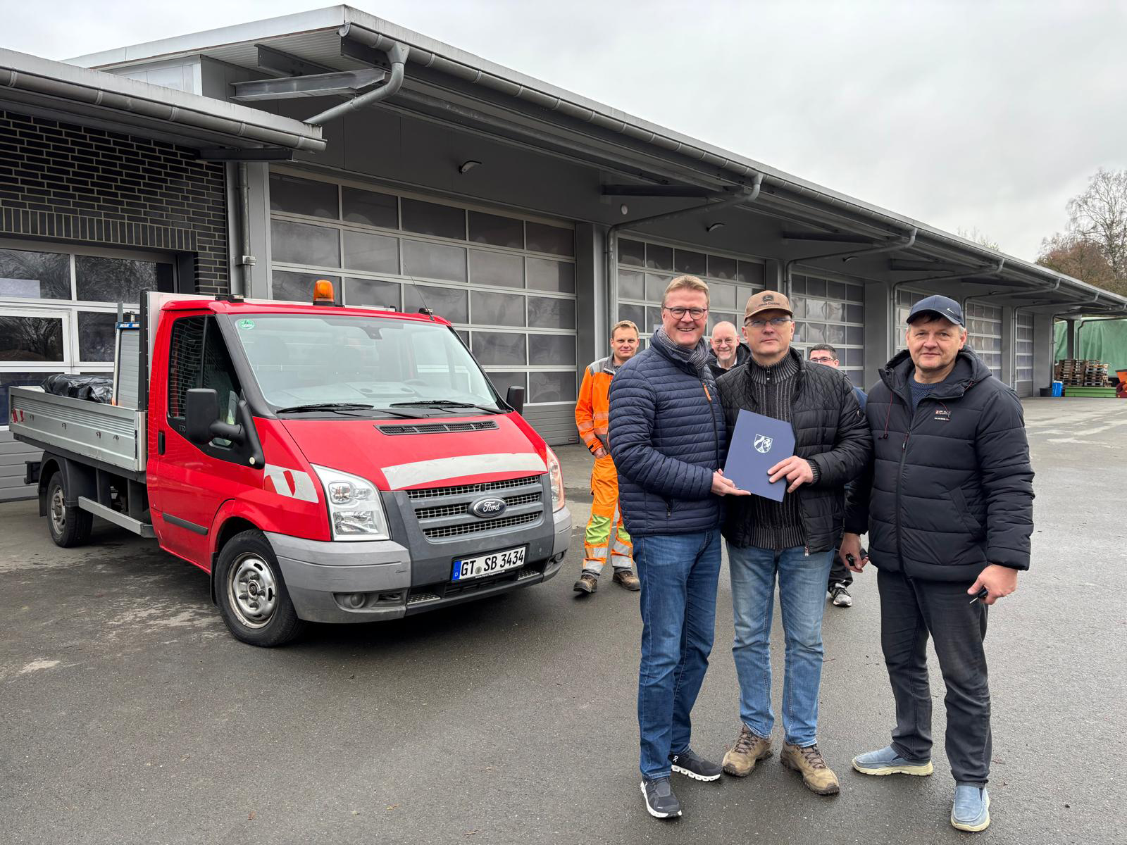 Kravas automašīna sagatavota ceļam uz Naukšēniem. No kreisās: Borgholchauzenas birģermeistars Dirks Spekmans, Jānis Zuments un Naukšēnu apvienības autovadītājs Dainis Rikmanis.