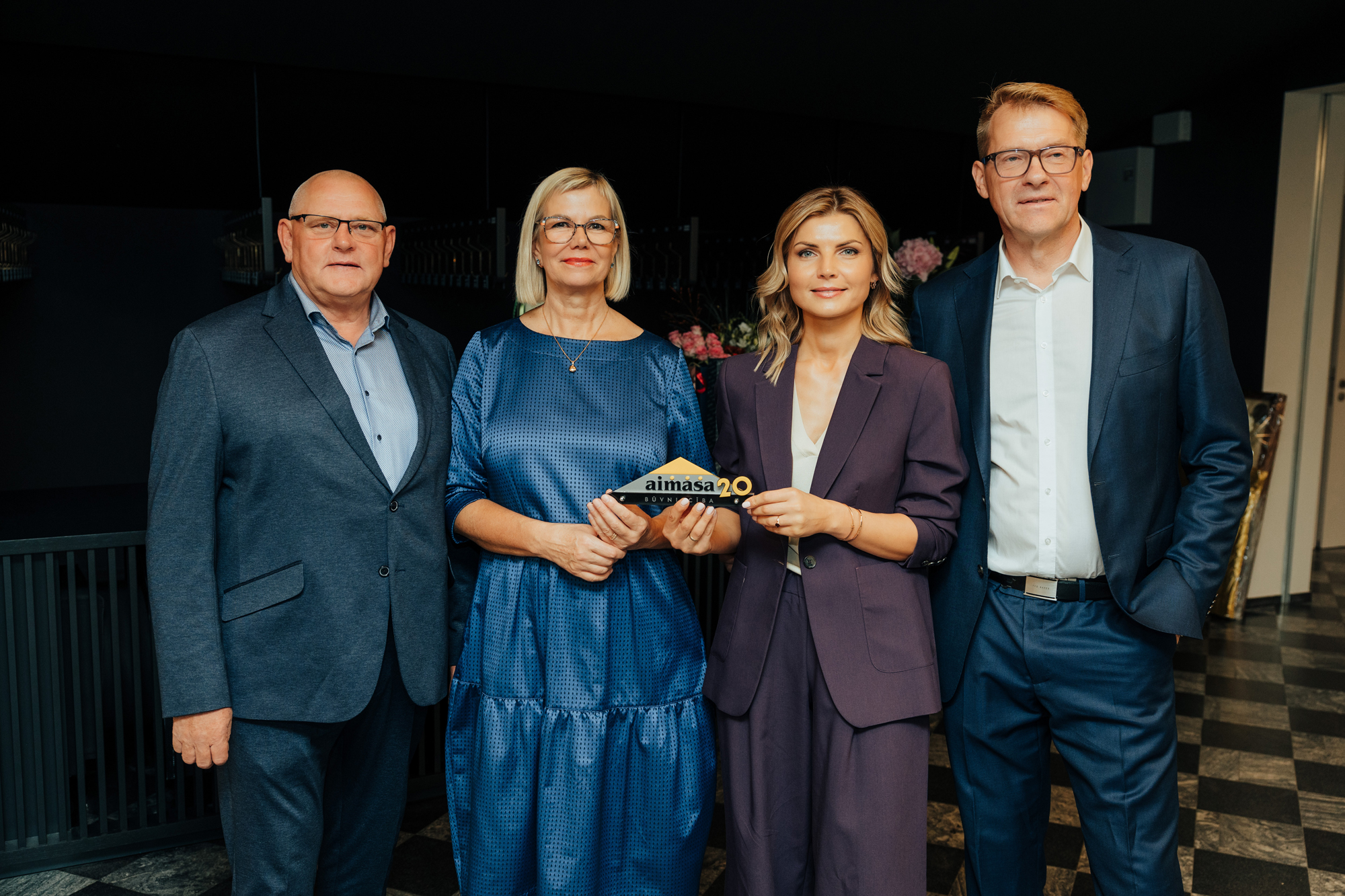 2024. GADA OKTOBRĪ. «Aimasas» 20 gadu jubilejas svinībās – Jānis Dreimanis (no kreisās), Ineta Dreimane, Madara Apsīte un Sandris Apsīts. Pasākums kopā ar otrajām pusēm. «Aimasas» arhīva foto