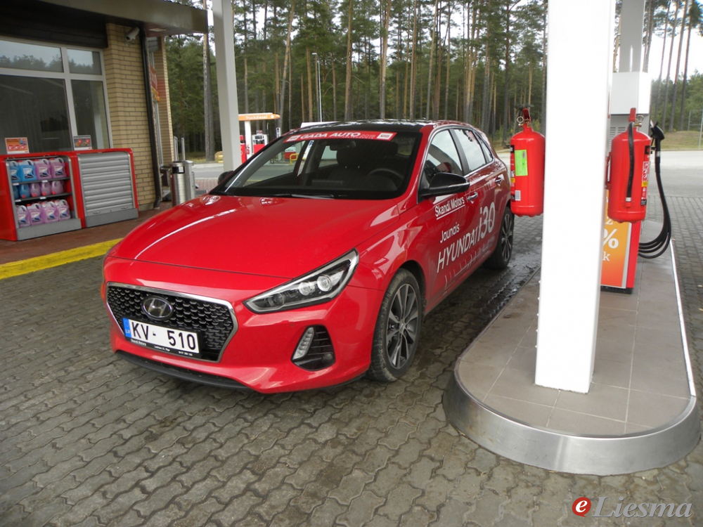 AGRESĪVĀKA SEJA. Šis foto no testa brauciena ilglaicīgās pieturas degvielas uzpildes stacijā, kur gandrīz pusstundu gan paši, gan ar sazvanītu ekspertu palīdzību meklējām, kā attaisīt degvielas bākas klapīti... Trešās paaudzes i30 nenoliedzami ieguvis agresīvāku dizainu auto priekšgalam, iespaidīgā radiatora reste un riktīgi aziātiski šaurie priekšējie lukturi, manuprāt, pircējiem patiks.