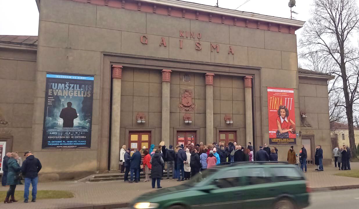 ĻAUŽU PŪLIS pie mūsu kino «Gaisma». Grūti teikt, kad iepriekšējo reizi tāds redzēts. Svētdien bija pirmā iespēja, bet tās vēl ir un būs, redzēt jauno Dzintara Dreiberga filmu «Tīklā. TTT Leģendas dzimšana».  Autores foto