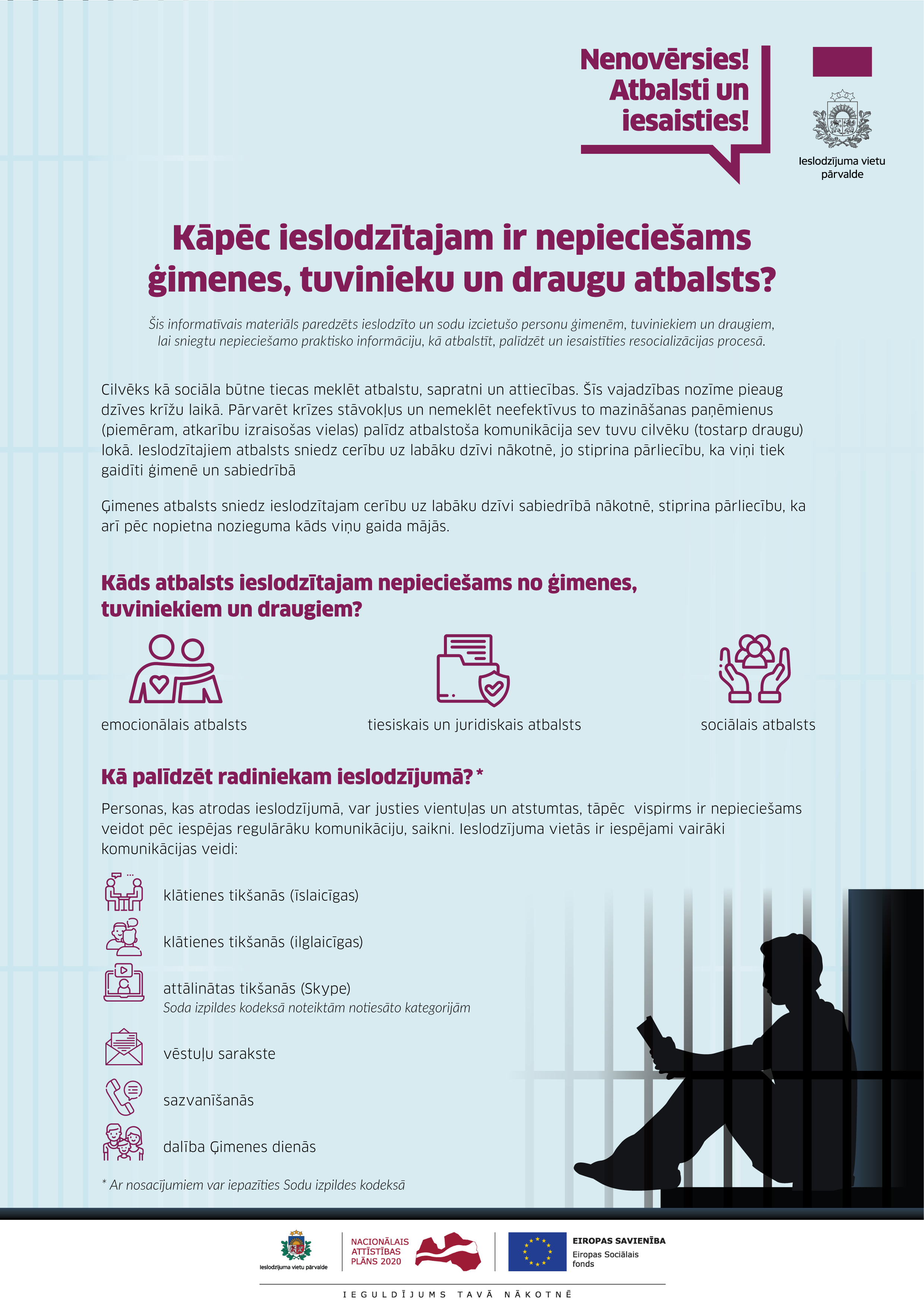 Tāpat bukletā ir norādīti iespējamie saziņas veidi ar ieslodzīto (saziņas nosacījumi ir noteikti Soda izpildes kodeksā), kā arī saraksts ar primāri risināmiem sociālajiem jautājumiem.