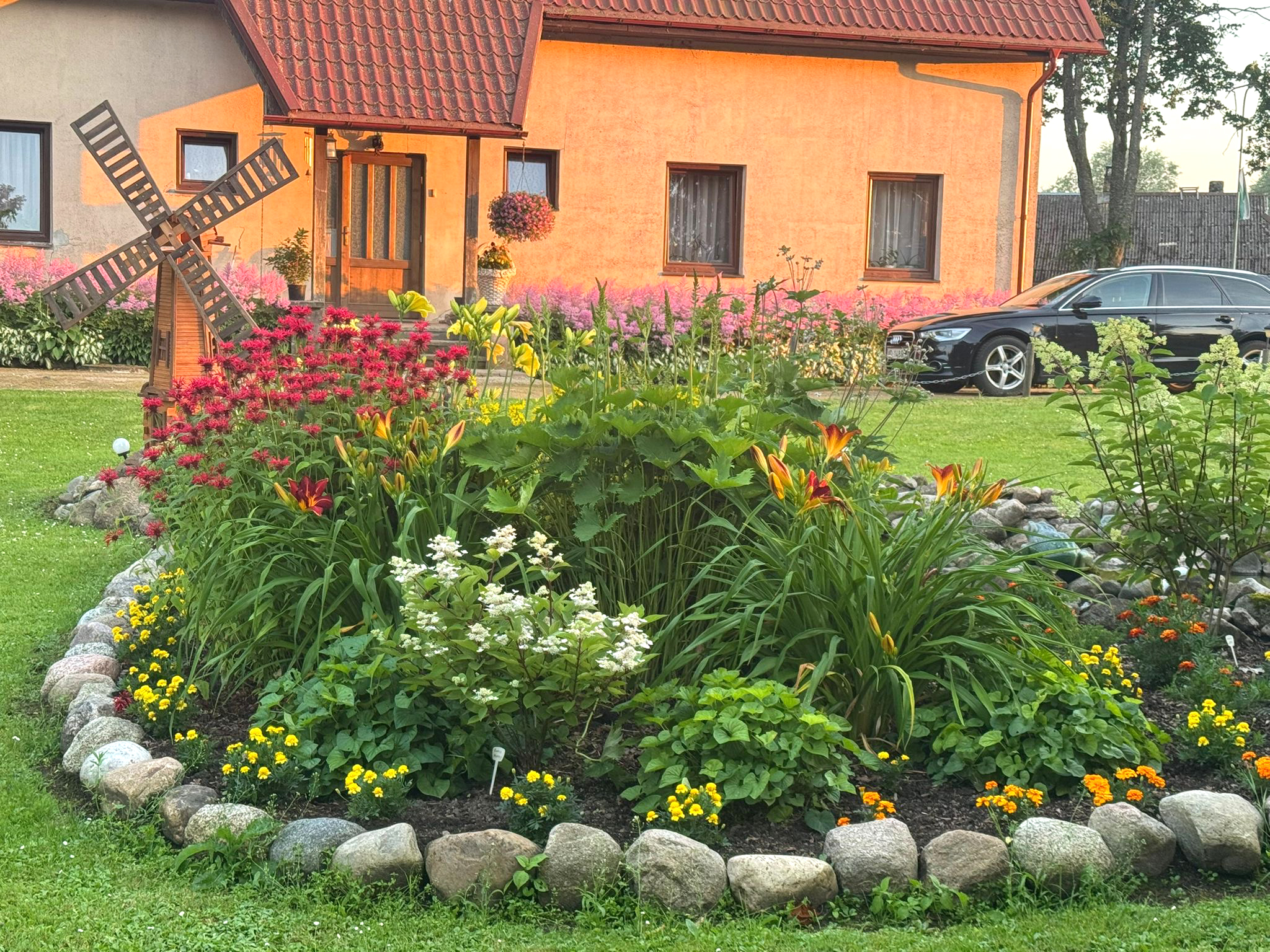 Kad pa akurāti nogrābto grantēto iebraucamo ceļu nonācām dzīvojamās mājas priekšā, nevarējām nepamanīt košo samteņu dzīvespriecīgos sveicienus dekoratīvo augu stādījumos. Izrādījās, ka Baibai tieši par samtenēm ir kāds stāsts: