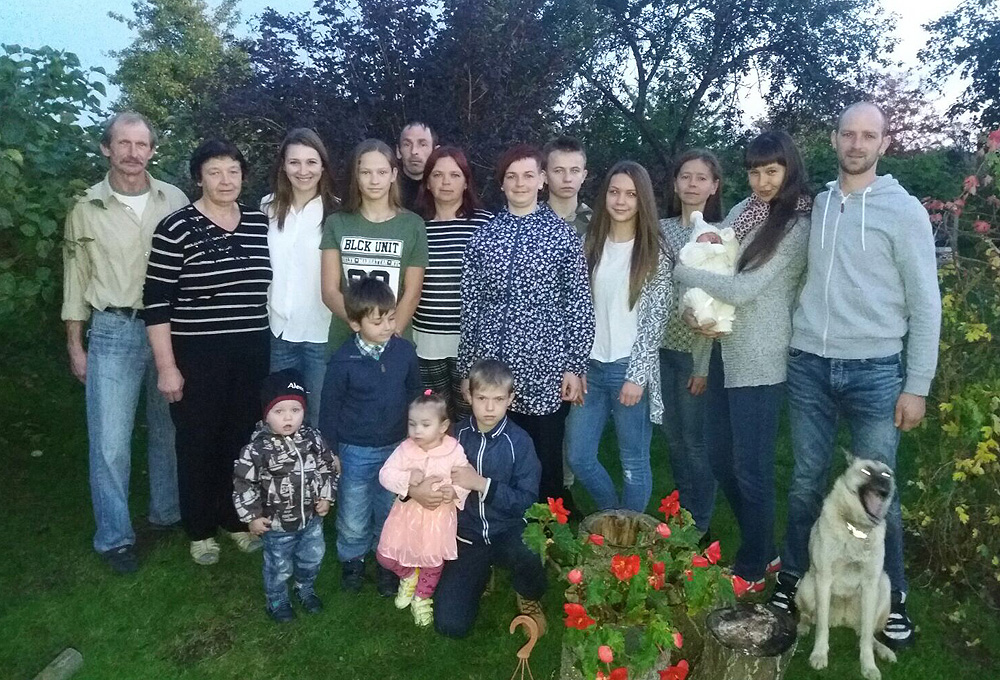 KUPLĀ ĢIMENE. Augšējā rindā (no kreisās) Egons, Lolita, Alīda Marija, Aiga, Māris, Gunita, Edīte, Artis Miks, Alvīne, Liena, Daiga ar Albertu, Didzis; priekšplānā Alens, Arvils, Alise, Adrians. Foto no ģimenes arhīva
