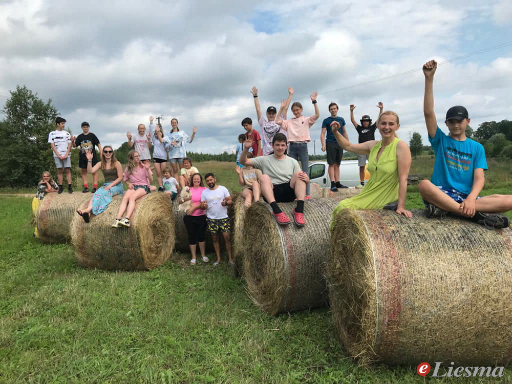 «PĒDĒJĀ NOMETNES DIENĀ apciemojām zemnieku saimniecību, kurā bija roka jāpieliek, jāpalīdz, jo laukos darbu daudz,» saka nometnes dalībnieki, pulcējoties kopbildei. Foto no Sadarbības platformas arhīva