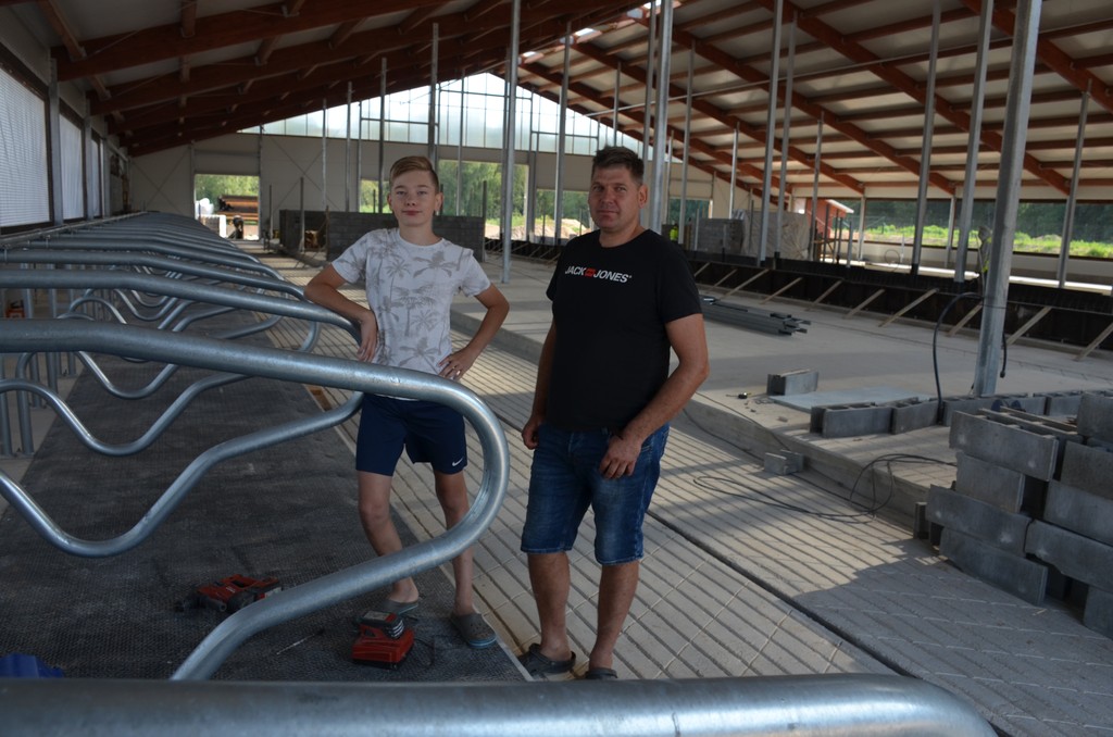Juris Rutkovskis ar vecāko dēlu Mārtiņu topošajā govju kūtī, kas būs viena no modernākajām apkaimē. Edītes Bēvaldes foto