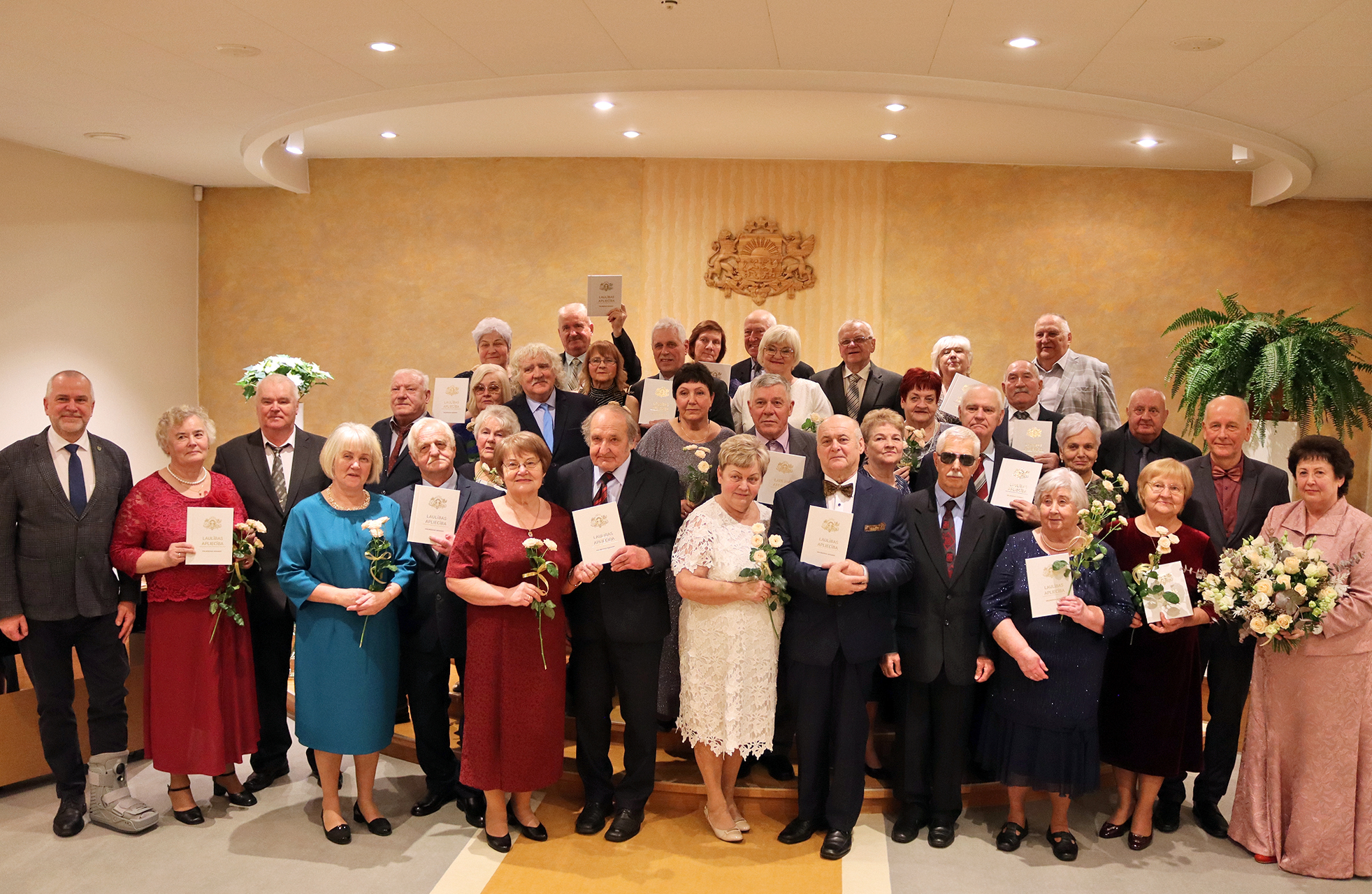 Vīru tumšie uzvalki ļāva sievām izcelties un sievišķīgi ziedēt. Vien sidraboti sirmā galvasrota kā vieniem, tā otriem liecināja par nodzīvotajiem gadiem. Taču tie ir bijuši īpaši, jo kopā soli solī laulībā nostaigāti 50 gadi. Tam par godu Valmieras novada Dzimtsarakstu nodaļā sestdien, 6. decembrī, valdīja svinīgs satraukums, gaidot Zelta pāru sveikšanas ceremoniju.