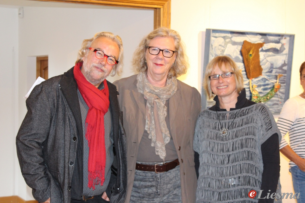 VALMIERAS MUZEJA IZSTĀŽU NAMĀ. Vācijas mākslinieki Kerstina Ūlmane un Kristofs Vinklers kopā ar Gīterslo apriņķa pašvaldības mākslas un kultūras projektu koordinatori Dr. Silvanu Kreijeri (vidū). Artas Rozītes foto