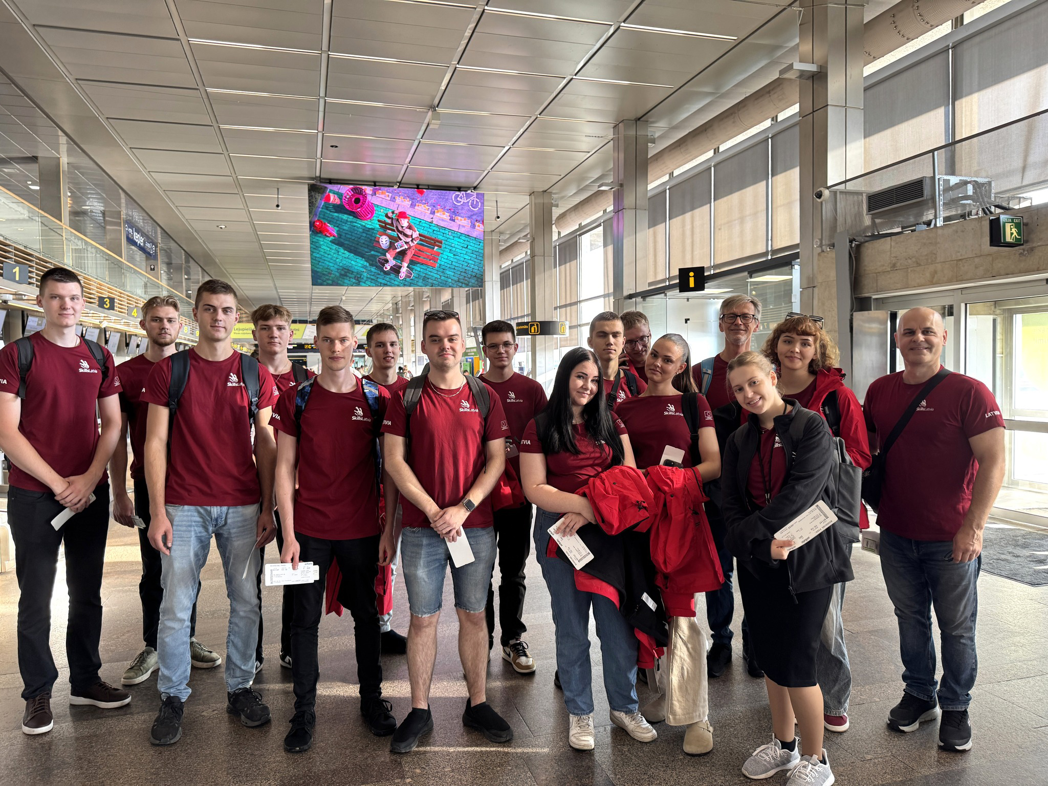 KOMANDA ceļā uz sasniegumiem. Talantīgi un zinoši jaunie profesionāļi, kuri pozicionēs Eiropā mūsu valsts profesionālās izglītības izaugsmi un tās kvalitāti, mirkli pirms došanās ceļā Rīgas lidostā.