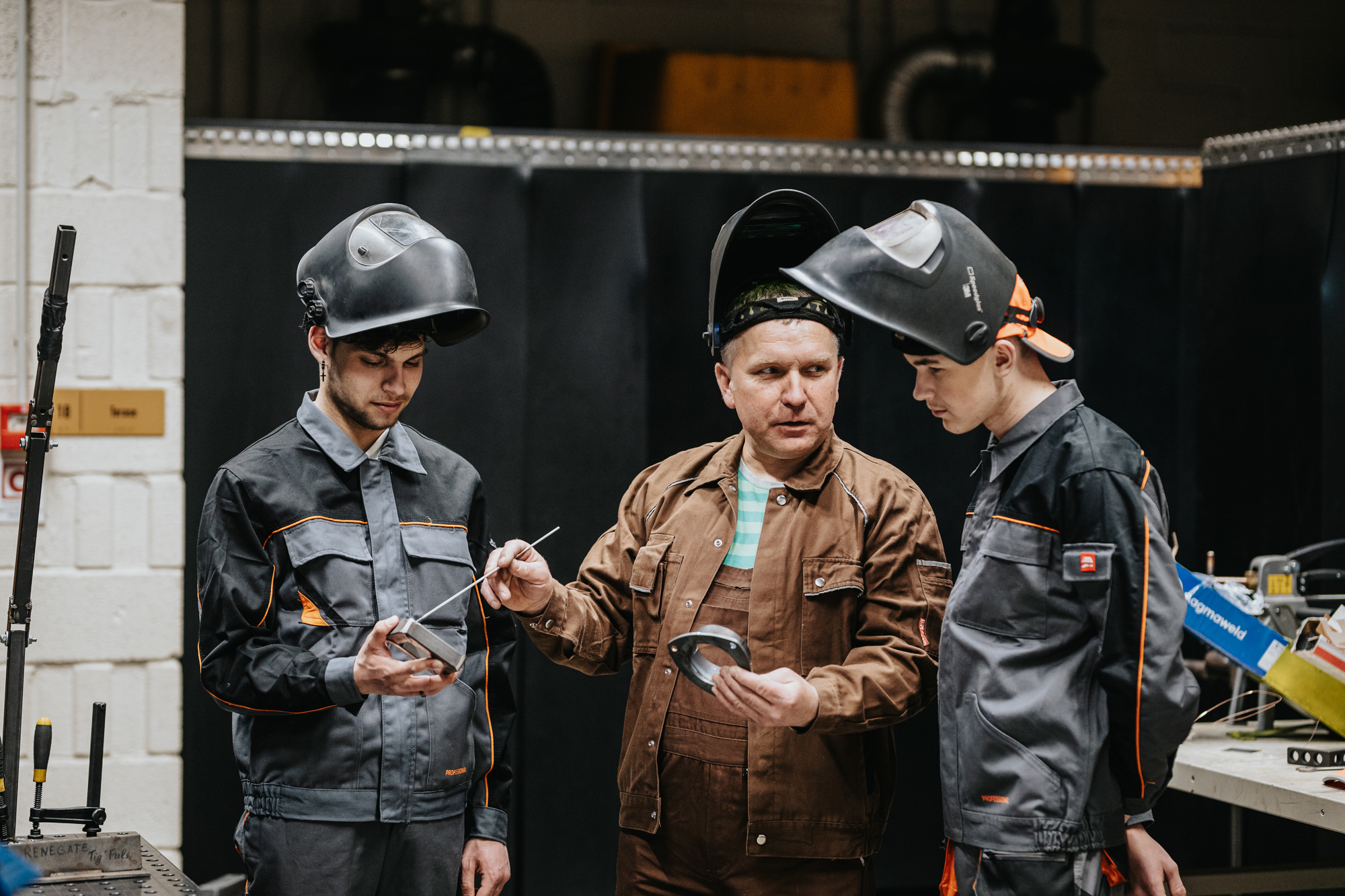 MĀCĀS TOPOŠIE METINĀTĀJI. Metināšanas telpā notiek lokmetinātāju metināšanā ar mehanizēto iekārtu aktīvās gāzes vidū sagatavošana. Foto no Valmieras tehnikuma arhīva